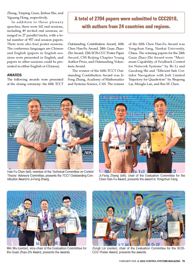 2018年7月25日至27日足球官网承办的第37届中国控制会议(CCC2018)获得圆满成功。本次会议受到国际学界关注,国际知名期刊《IEEE Control Systems Magazine》对会议作了大篇幅报道。