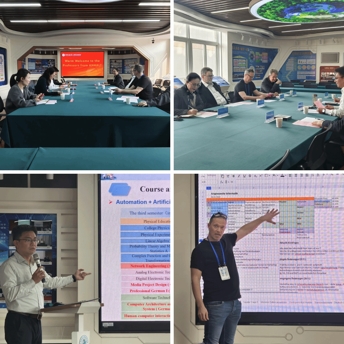 双方进入正式会议环节。会议由副院长陈略峰教授主持。他首先对德方代表的到访表示热烈欢迎,并介绍了中方参会人员。随后,他就自动化专业(中外合作办学)的培养方案整体框架作了系统介绍,涵盖课程体系、培养目标、实践教学安排等内容。德方院长Alexander Carôt教授随后就德方负责的核心课程设置与教学实施细节进行了详细说明。在自由讨论环节,双方就课程衔接优化、学生语言能力提升及专业素养综合培养等关键议题深入交换了意见,达成了广泛共识。